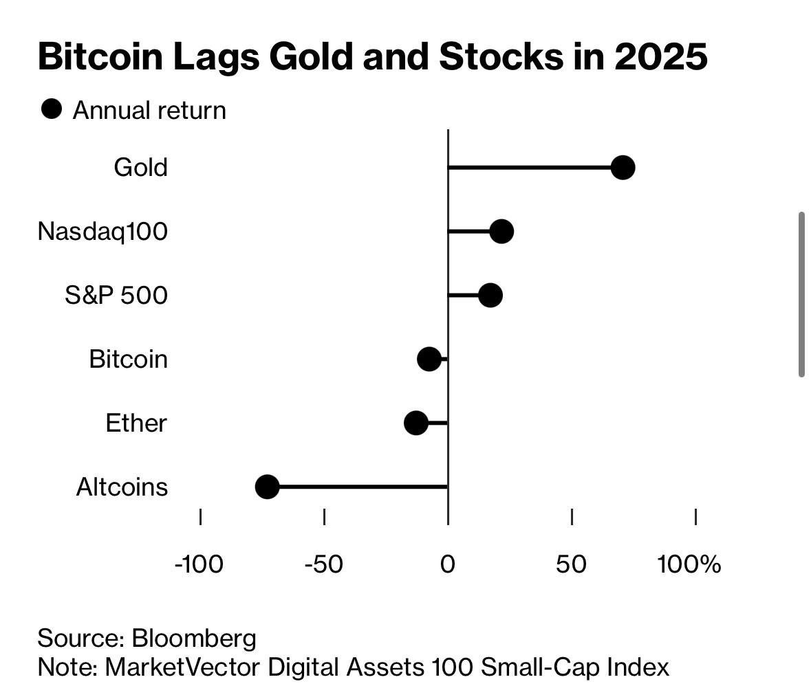 долларов и не проявляет активности, — Bloomberg В то время как традиционные рынки завершают год на подъёме Сильное падение в октябре снизило токен примерно на 30%, и он движется к худшему кварталу со второго квартала 2022 года. Объёмы торгов невелики, розничные инвесторы пассивны, а биржевые фонды стали чистыми продавцами. Американские акции показали «рождественское ралли», а золото достигло исторических максимумов около $4500 за унцию, показав рост более 70% за год — лучший результат с 1979 года. ➡️Простые инвестиции