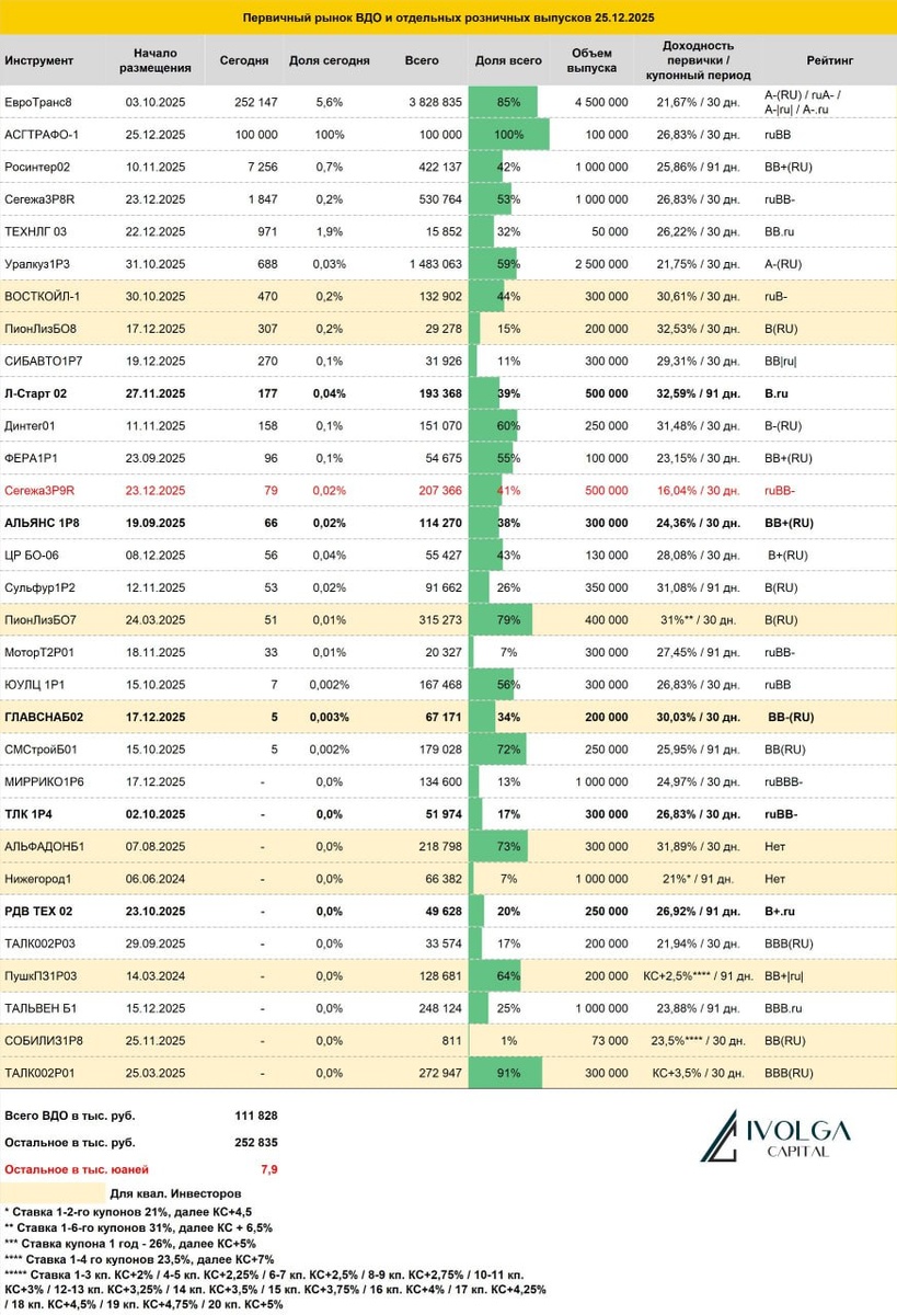 Итоги первичных размещений ВДО и некоторых розничных выпусков на 25 декабря 2025 г.