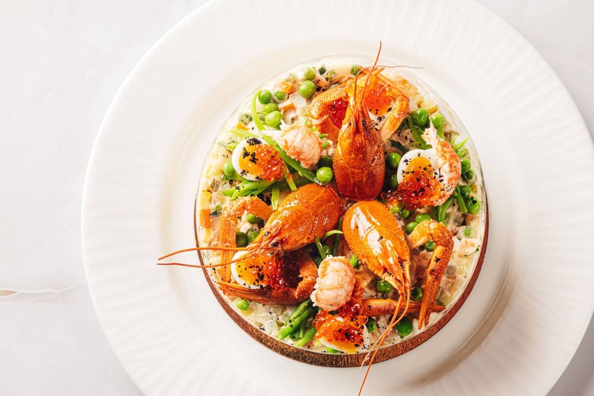 Шеф-повар Алексей Мартынов, ресторан "Рыба моя" #рецепты #новогодниеправилашефа Ингредиенты Картофель запечённый 70 г Морковь запечённая 60 г Огурцы свежие 70 г Горошек зелёный свежемороженый 60 г Яйцо куриное 2 шт. Тигровые креветки 120 г Огурцы солёные 55 г Перепелиные яйца 2 шт. Соус на оливье 90 г Красная икра 15 г Шпинат мини 5 г Раки живые 200 г Приготовление Овощи: морковь, картофель промыть, обернуть в фольгу, запечь в духовке в течение 30-50 минут при температуре 180 градусов. Затем очистить от кожуры и нарезать кубиком. Яйца куриные отварить, почистить и нарезать кубиком. Огурцы солёные и свежие нарезаем кубиком. Креветки обжарить на сковороде на оливковом масле, посолить и поперчить. Нарезать кубиком. Раки живые отварить в солёной воде с добавлением лимона, перца горошком и лаврового листа. Далее очистить. Головы сохранить для декора. Для соуса понадобится домашний майонез (можно купить готовый), трюфельное масло. Смешать майонез и трюфельное масло. Яйца перепелиные сва