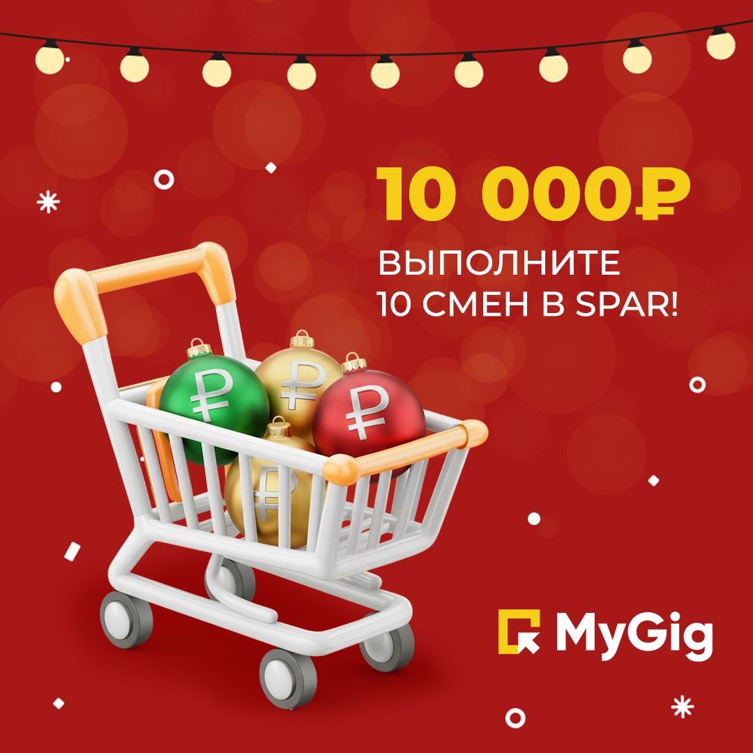 ! Зимой можно не только отдыхать, но и получить 10 000 ₽ за подработки в SPAR 😱 Всё просто: Выполните 10 смен в период с 26 декабря 2025 по 11 января 2026 включительно: — каждая смена — не менее 8 часов, — не более 1 смены в день, — в любом городе РФ, по любой профессии, — для новичков и опытных гигеров, — смены должны быть забронированы через приложение «MyGig». 10 000 ₽ поступят в течение 7 рабочих дней после завершения акции и подписания акта сдачи-приёмки выполненных услуг. Акция длится всего 17 дней, но этого достаточно, чтобы спокойно завершить смены и получить бонус! Подробнее на сайте Преимущества подработки в SPAR через MyGig: ✅ бесплатный обед на смене ✅ уже сейчас действуют +20% к ставкам по всем профессиям — до 15 января в Москве и области, Санкт-Петербурге, Казани, Пензе, Йошкар-Оле, Нижнем Новгороде и Дзержинске ✅ компенсация медкнижки до 3000 ₽ — для новых исполнителей при выполнении условий ✅ хороший и дружный коллектив Пока другие выбирают украшения для ёлки, в