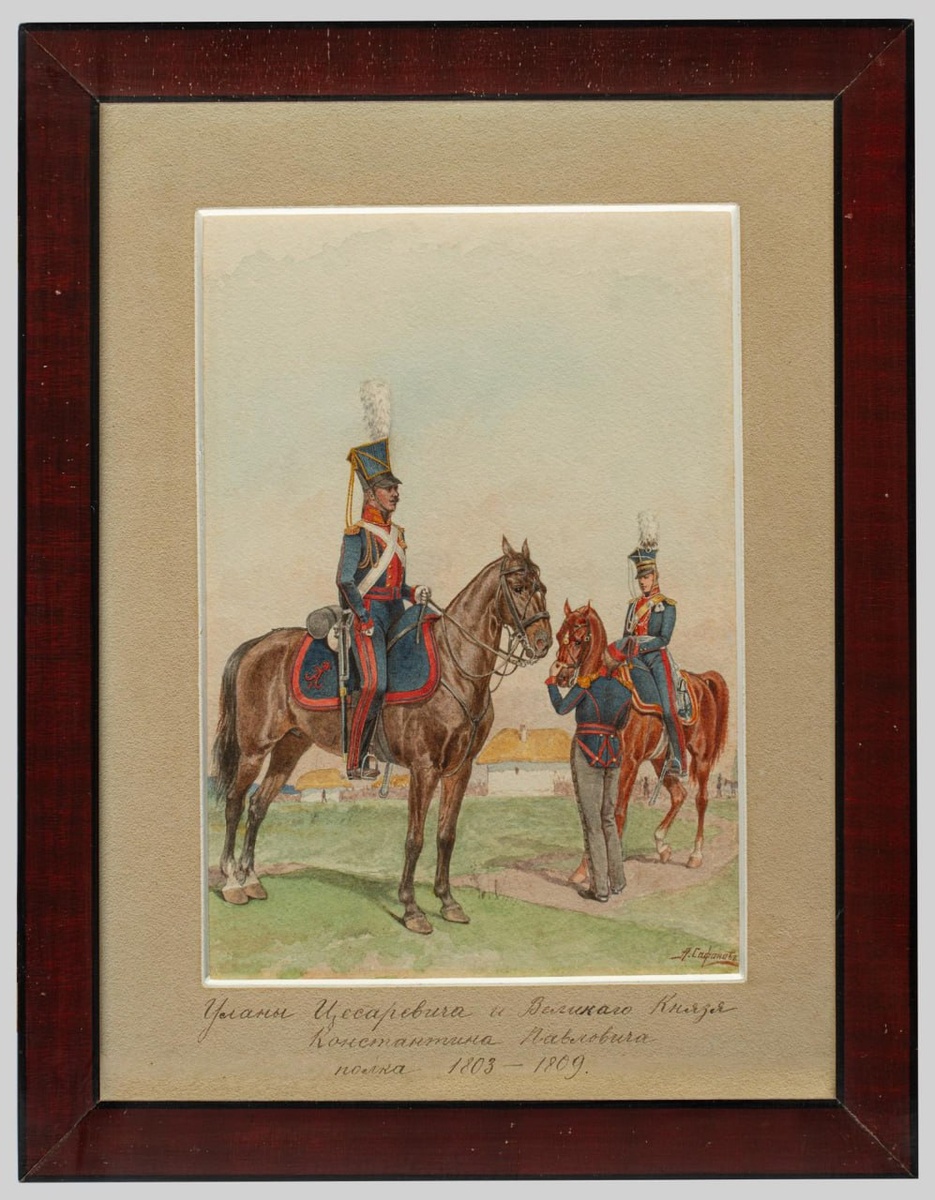 году известным униформологом А. П. Сафоновым (1852–1913). На листе размером 23×16 см (в свету) с поразительной точностью воссозданы парадные мундиры уланов эпохи Александра I. Работа выполнена на бумаге акварелью, отличается исторической достоверностью и вниманием к деталям — от погонов до вооружения. Входит в коллекцию оригинальной графики (инв. № АИМ 2162, ГИМ 83773/2348) и демонстрировалась на выставке «Сокровища полковых музеев» (ГИМ, 2024). #ЛейбГвардия #КонстантинПавлович #УланскийПолк #военнаяформа #Сафонов #акварель #РоссийскаяИмперия #АлександрI #ГИМ #историяармии
