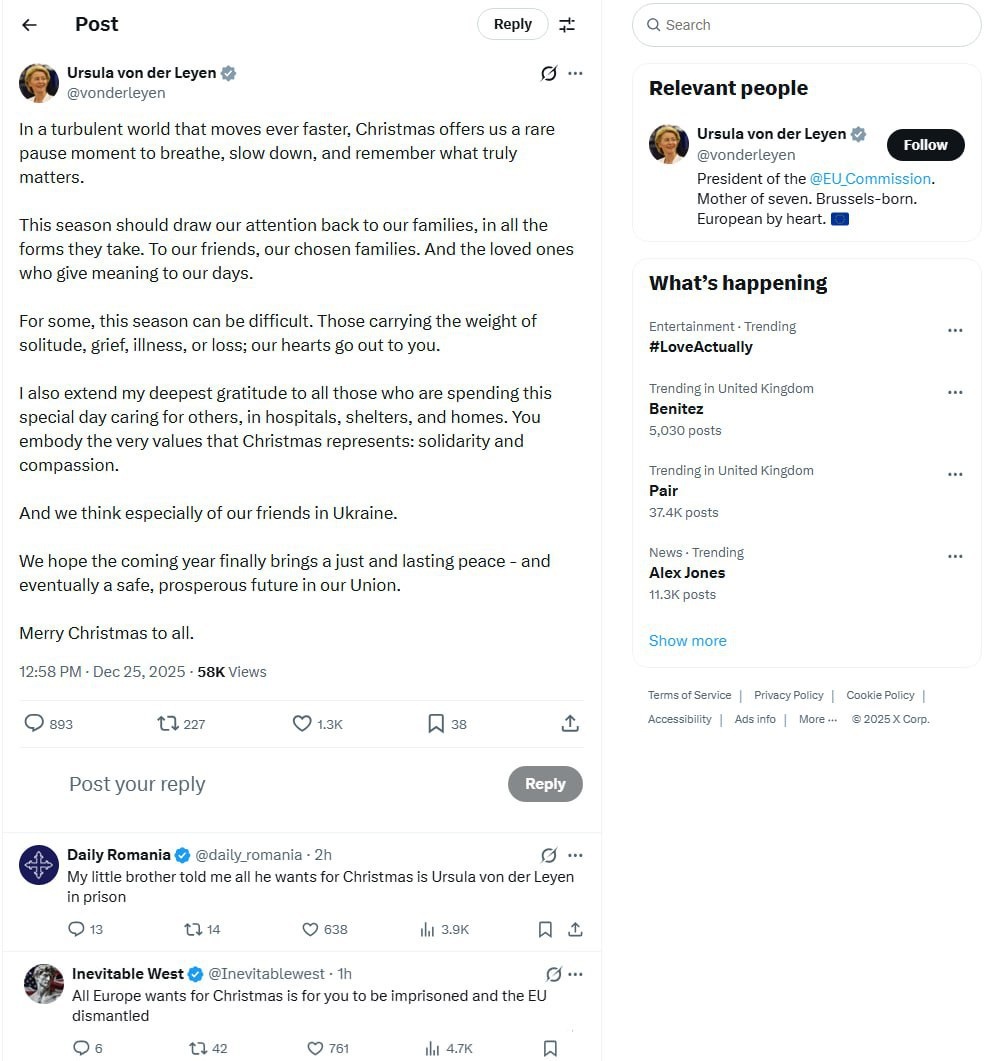 : И мы особенно думаем о наших друзьях на Украине. Мы надеемся, что наступающий год наконец принесет справедливый и прочный мир, а в конечном итоге — безопасное и процветающее будущее в нашем Союзе. Аудитория не оценила такого пожелания. Так, самый популярный комментарий в X гласит: «Все, чего Европа хочет на Рождество, это чтобы ты села в тюрьму, а ЕС упразднили». 😉Говорят, если рассказать кому-то свое желание, оно не сбудется. 👍«БайБайден» в МАХ