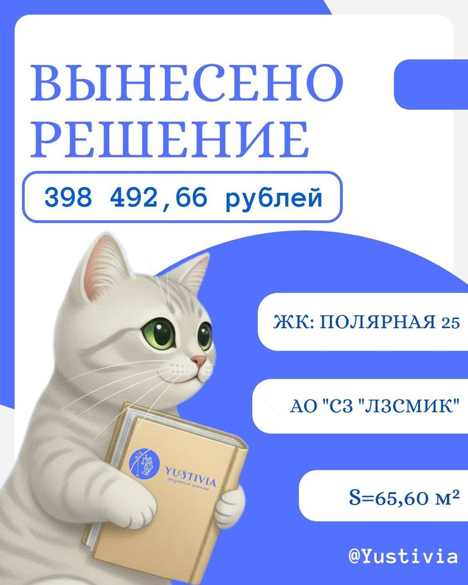 ➿➿➿➿➿➿➿➿ Застройщик: АО "СЗ "ЛЗСМИК" 🟧 ЖК: ПОЛЯРНАЯ 25 Площадь - 65,60 м² Суд: Бабушкинский районный суд г. Москвы Судья: Меркушова А.С. Дело: № 02-7973/2025 ➿➿➿➿➿➿➿➿➿ Взысканные суммы: Недостатки: 294 361,63; Моральный вред: 10 000; Суд. расходы: 94 131,03. ➿➿➿➿➿➿➿➿➿ 💸Итого в пользу клиента: 398 492,66 рублей. ❤️Приёмка квартиры и строительно-техническая экспертиза – за наш счет! Лучше звоните Юсти❤️ ➿➿➿➿➿➿➿➿➿ 📞+7 (936) 333-33-48 ✅@Yustivia 🌐yustivia.ru