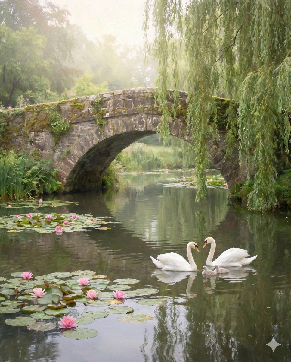 ! ✨ Туман окутал старинный мостик, ива склонила свои ветви к воде, где царит покой и природный уют. 🌿 Посмотрите на эту лебединую семью среди кувшинок — настоящий символ волшебства и гармонии. Это место, где хочется остаться навсегда и просто наслаждаться тишиной. Разве не о таком сказочном уголке мы все мечтаем? 🍄🏡🧚♀️ #сказочныйсад #дачныйдекор #уют #ландшафтныйдизайн