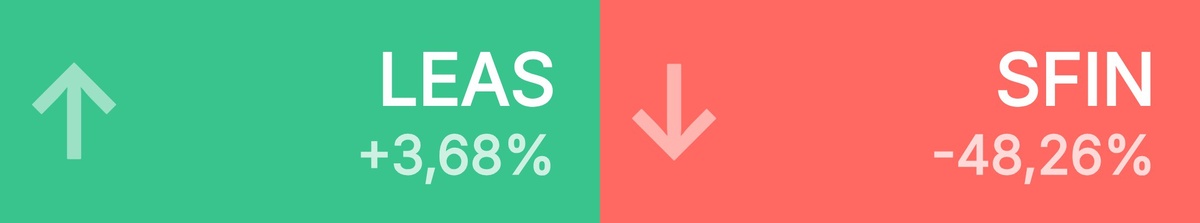 : Европлан • 563 ₽ • 3,68% ФосАгро • 6 355 ₽ • 3,13% ЮМГ • 885 ₽ • 2,73% Озон • 4 315 ₽ • 2,59% Инарктика • 502 ₽ • 2,32% Мечел • 74,81 ₽ • 1,31% Мечел прив • 65,85 ₽ • 1,31% Озон Фарма • 51,10 ₽ • 0,67% VK • 290 ₽ • 0,59% КЦ ИКС 5 • 2 980 ₽ • 0,54% 🔻 Топ-10 лидеров падения среди крупнейших акций: ЭсЭфАй • 946 ₽ • -48,26% Группа ЛСР • 641 ₽ • -2,73% Мосэнерго • 2,08 ₽ • -2,28% Селигдар • 43,80 ₽ • -2,01% Московский • 6,37 ₽ • -1,97% М.Видео • 78,35 ₽ • -1,76% РуссНефть • 98,00 ₽ • -1,66% Аэрофлот • 56,92 ₽ • -1,64% ПИК • 483 ₽ • -1,63% ГК Самолет • 956 ₽ • -1,60%
