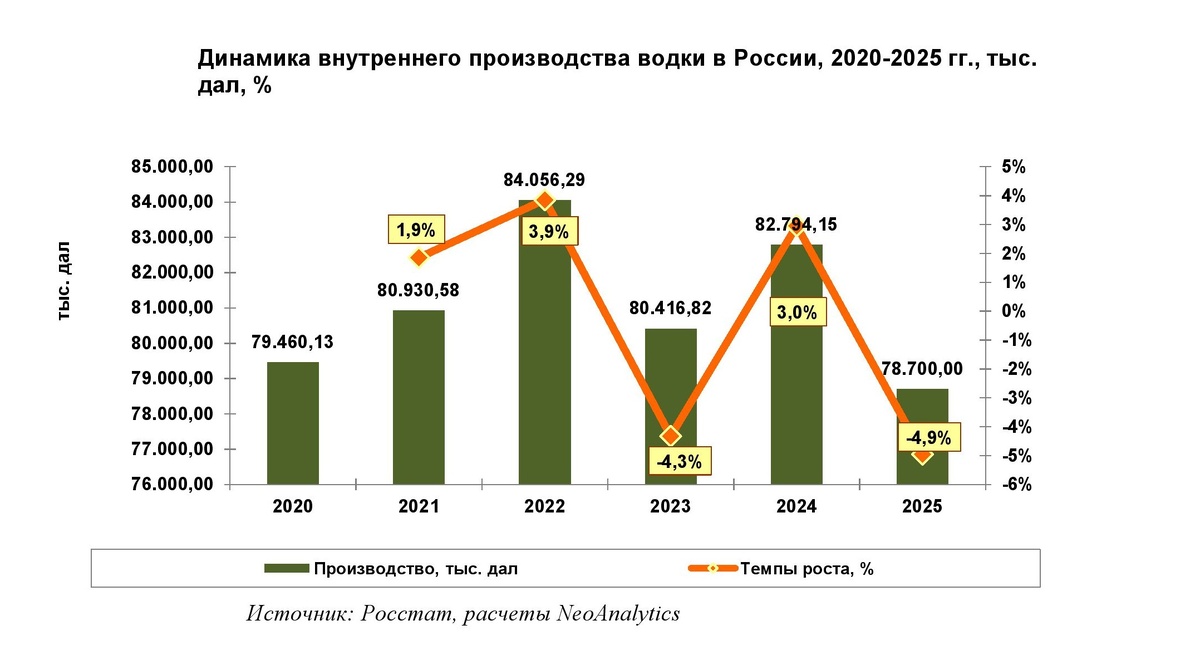 В ходе исследования, проведенного NeoAnalytics на тему «Российский рынок водки: итоги 2025 г., прогноз до 2029 г.», выяснилось, что в 2025 г. объем внутреннего производства водки сократился на 5% относительно аналогичного показателя годом ранее и ожидается на уровне 78,7 млн. дал. Это самый худший показатель в ретроспективе 2020-2025 гг. Пик производства пришелся на 2022 г., когда было произведено 84 млн. дал водки. Также вполне благоприятным годом был 2024 г. Годом ранее объем увеличился на 3%. Помесячная динамика периода январь-декабрь 2023-2025 гг. показывает, что практически в каждом месяце в течение 2025 г. производство было меньше по сравнению с периодом 2023-2024 гг. Исключение составил апрель 2025 г., когда объем внутреннего выпуска опережал за аналогичные периоды. Фактор сезонности оказывает влияние на динамику внутреннего производства, но имеет свою особенность. Год, как правило, начинается с производства малых объемов. В последующие месяцы до декабря динамика увеличивается.