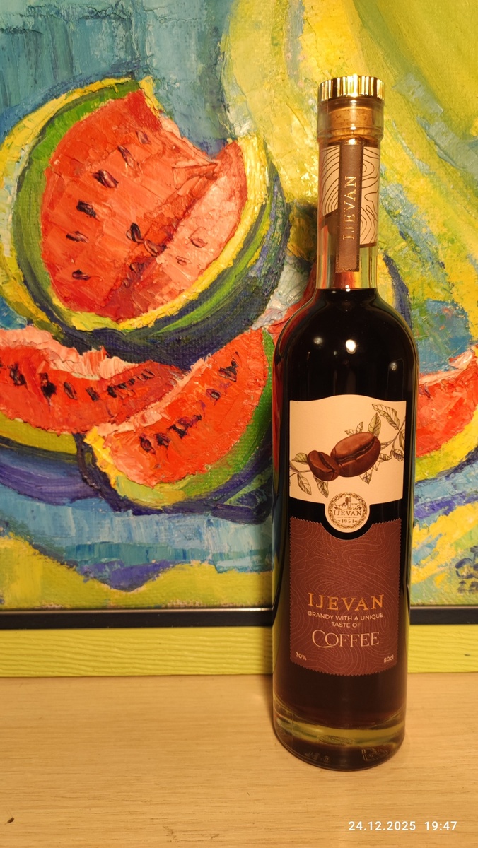 Всем привет от меня, КОньячного Маньяка и наших друзей! Пробую третью вкусняшку от Иджевана. Заранее понятно, что она будет аналогом Вишнёвой, только со вкусом кофе. Так оно и есть. Состав здесь тот же, с знаменитым министром. Семилетний коньяк «Черчилль» доводится до 30 градусов родниковой водой и добавляется Кофе (арабика). Тот же коньяк, сорта винограда, год урожая 2015 и дата розлива 2024г. Бокал роскошно благоухает арабикой. Но спектр здесь куда шире! Шоколад, мёд, мороженое пломбир, и внятные коньячные нотки! Вот здесь уже не просто вкусно, но и интересно. Если и вкус подобный... И вкус не подкачал! Практически коньячный, довольно мягкий, скорее всё таки фруктово-сухофруктовый, с уклоном в чуть подкисшую курагу и кисловатые фрукты: алычу, сливу, и даже манго и киви. Арабика в букете является лишь очередным тоном в списке. Если не знать, по вкусу кофейный напиток можно и не определить. Только вот послевкусие, как и аромат, не даст об этом забыть: оно вновь отлично выявляет вкус ар