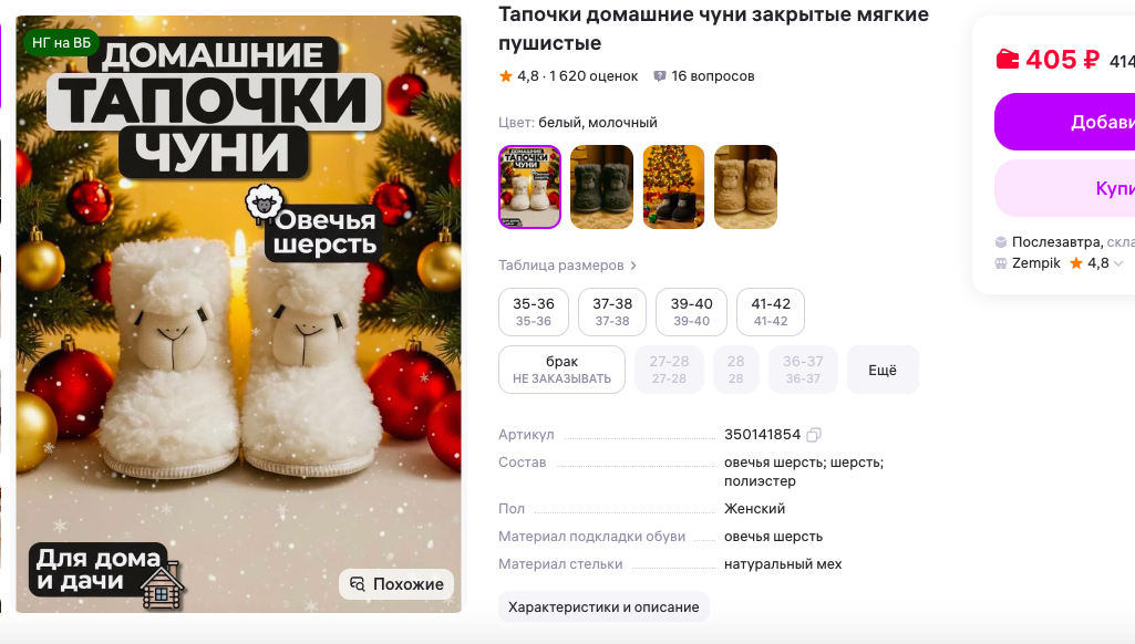 1.Тапочки с мордочками овечки (WB, арт 350141854)