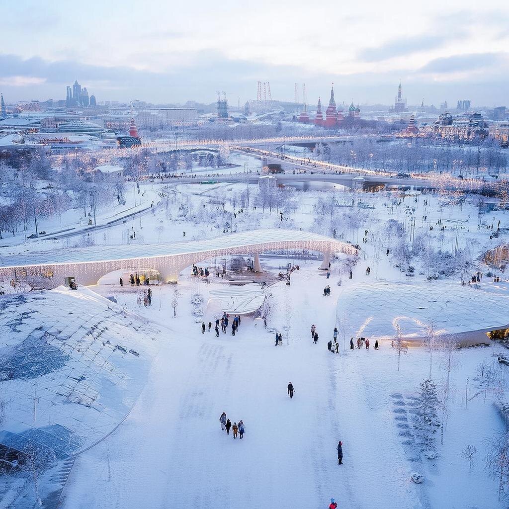 - Где лучше всего фотографироваться в Зарядье зимой? Самые эффектные снимки получаются на Парящем мосту с видом на Кремль, под Стеклянной корой в снегопад и в заснеженной тундре на фоне Москва-Сити.