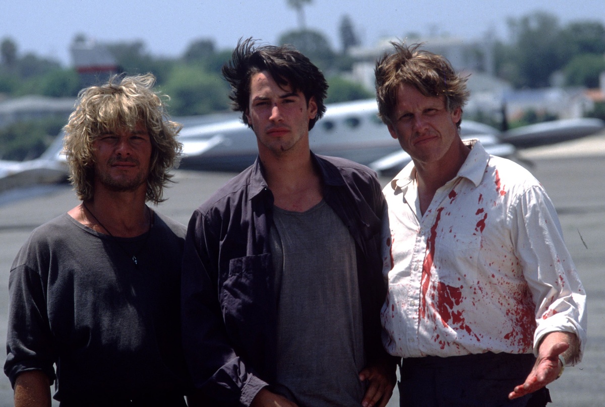 Патрик Суэйзи (39 лет), Киану Ривз (26 лет) и Гэри Бьюзи (46 лет) на съемках фильма "На гребне волны