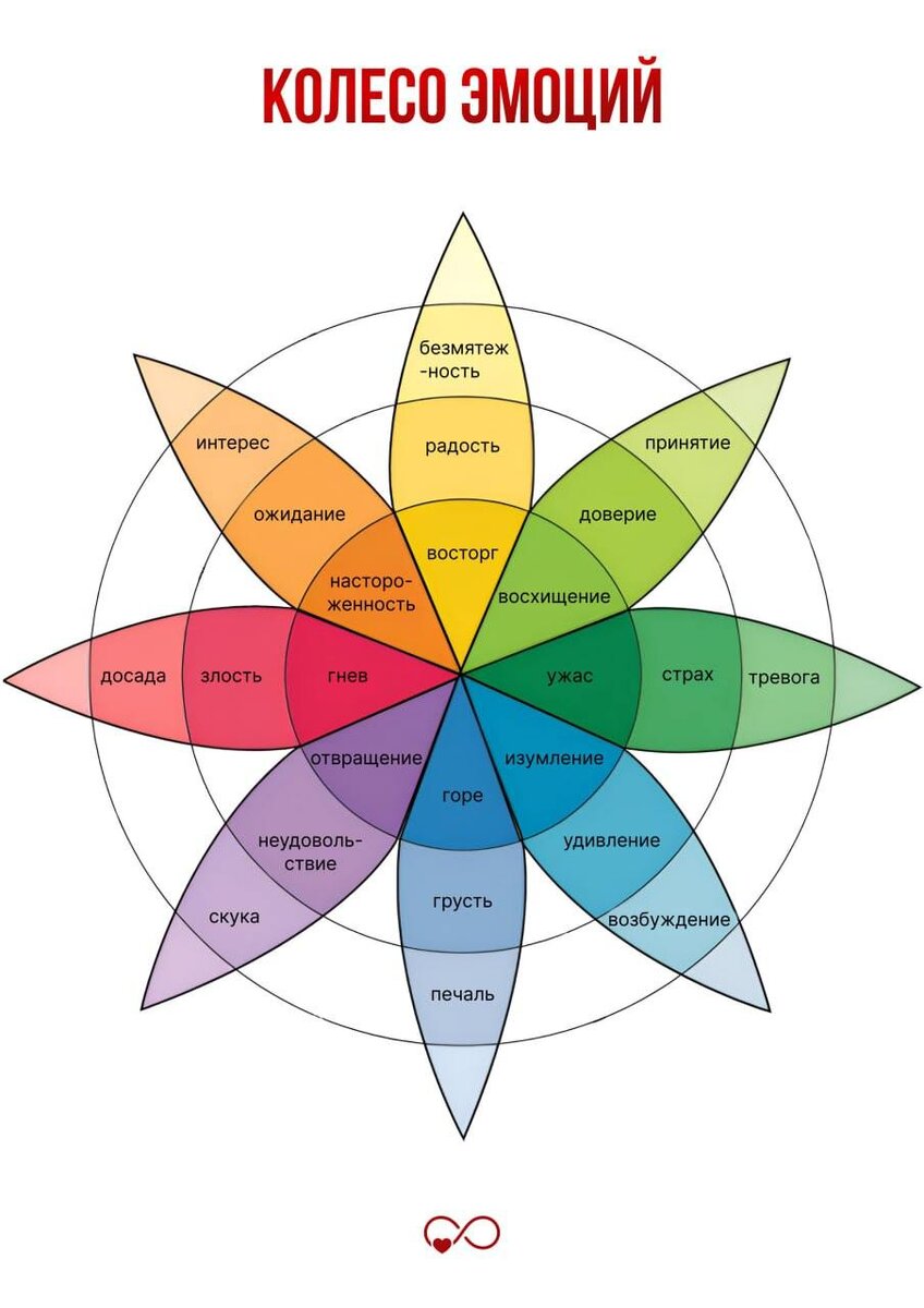 Как вы себя чувствуете? Какие эмоции сейчас испытываете? Человек может испытывать 27 эмоций, которые тесно связаны между собой. А если в список добавить все эмоциональные оттенки и чувства, он увеличится до 500 наименований. При этом на вопрос «как ты?» большинство людей отвечает: «плохо», «нормально», «так себе». И не могут ни понять, ни объяснить, почему плохо. И что нужно изменить! Хотя именно понимание своих эмоций даёт возможность улучшать свою жизнь. На картинке вы видите колесо эмоций Роберта Плутчика. Его используют для развития эмоционального интеллекта и для работы с дневником эмоций. Роберт Плутчик выделил и разместил восемь основных эмоций на схеме, которая похожа на восьмилистный цветок. Эмоции, которые находятся друг напротив друга, являются полярными: Каждый лепесток показывает, как от физиологического проявления (например, гнева) в центре цветка мы переходим в социальное проявление (злость, а затем досада). Вы можете поставить будильник на какие-то отрезки в времени и