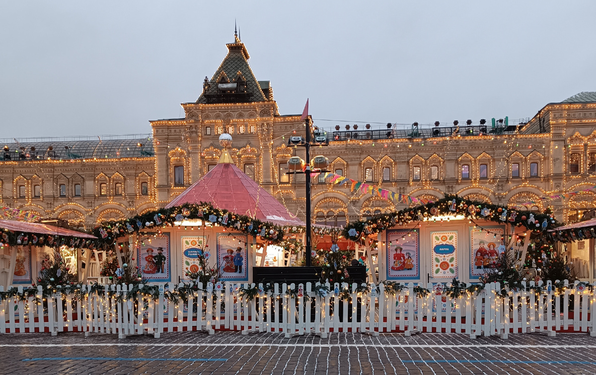 25 декабря 2025 года Здравствуйте, друзья! Вчерашний день, начавшийся среди сказок (в конце ссылка на статью о том, как это было), продолжился в парке "Зарядье", где в ресторане "Восход", предварительно забронировав столик, можно было заказать "Московское чаепитие". О том, что такой формат существует я что-то слышала, но толком не представляла, что же там такого к чаю подают. Вот и посмотрим! Но сначала мы той же дружной командой из трёх человек доехали от Делового центра до Александровского сада и пошли мимо Кремля и Красной площади с катком и ярмаркой в парк "Зарядье". Время было совсем не позднее, но день пока ощутимо не прибавился, а неумолимо склонялся к вечеру. Вот уже и разноцветные огоньки зажглись. Вот эта мозаика на горке в реальности смотрится, как самоцветы, на фото как-то бледновато получилось. А вот и наш "Восход". В прошлом году мы встречались здесь под Новый год, нам понравилась доброжелательная атмосфера и живая музыка, но в этом году не получилось забронировать на вых