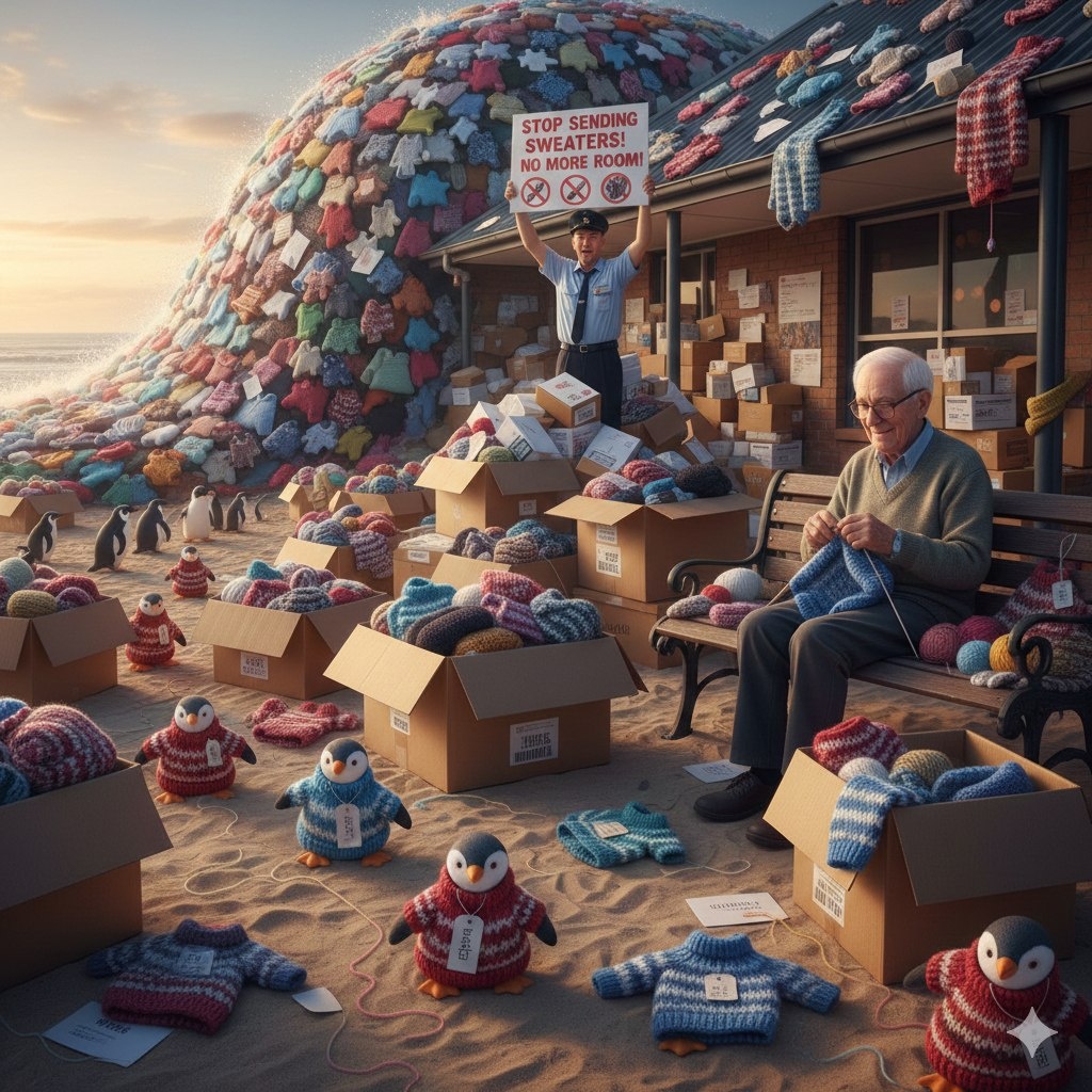 🐧🧶🇦🇺🤣 Друзья, это реальная история о том, как доброта миллионов людей превратилась в «текстильное наводнение»! 🌊 📦 В 2001 году экологи острова Филиппа попросили добровольцев связать свитера для пингвинов, пострадавших от разлива нефти. 🐧🩹🧴 Зачем? — Свитера мешали птицам чистить перья клювом, чтобы те не травились токсичной нефтью. 🧼👔🛡️ Новость стала вирусной, и на помощь пришли тысячи бабушек со всего мира! 🌏👵🧶 Но вместо нужной пары сотен на остров прислали более 50 000 свитеров! 📈🏤📦 Почта крошечного городка буквально утонула в посылках. 📬🆘😱 Пингвинов на острове было меньше, чем присланной одежды! 🐧👔 Экологи умоляли мир: «Пожалуйста, остановитесь, нам некуда их складывать!» 🚫🧶🙅♂️ 📢 Самым известным помощником стал 109-летний Альфред Дейт, который вязал крошечные джемперы до последнего дня! 🏆👴✨ А лишние свитера теперь носят плюшевые пингвины в сувенирных лавках. 🧸💰🛍️