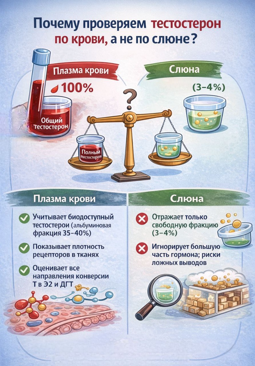 При оценке андрогенного статуса принципиальное значение имеет метод измерения тестостерона. Наиболее информативным и клинически корректным остаётся исследование общего тестостерона в плазме крови. Анализ по слюне отражает исключительно свободную фракцию гормона, которая составляет около 3–4% от общего количества тестостерона в организме. Такой подход даёт крайне ограниченное представление о реальном гормональном обеспечении тканей и не позволяет судить о системных процессах регуляции. В крови значительная часть тестостерона циркулирует в связи с альбумином (35–40%). Эта связь нестабильна: гормон легко высвобождается и активно участвует в тканевых реакциях. Именно эта фракция обеспечивает адаптацию, метаболические эффекты, поддержание мышечного тонуса и нейрокогнитивные функции. Анализ слюны эту часть полностью игнорирует. Кроме того, общий тестостерон выполняет сигнальную функцию. На его уровень ориентируется гипоталамо-гипофизарная система при регуляции тропных гормонов, печень - при