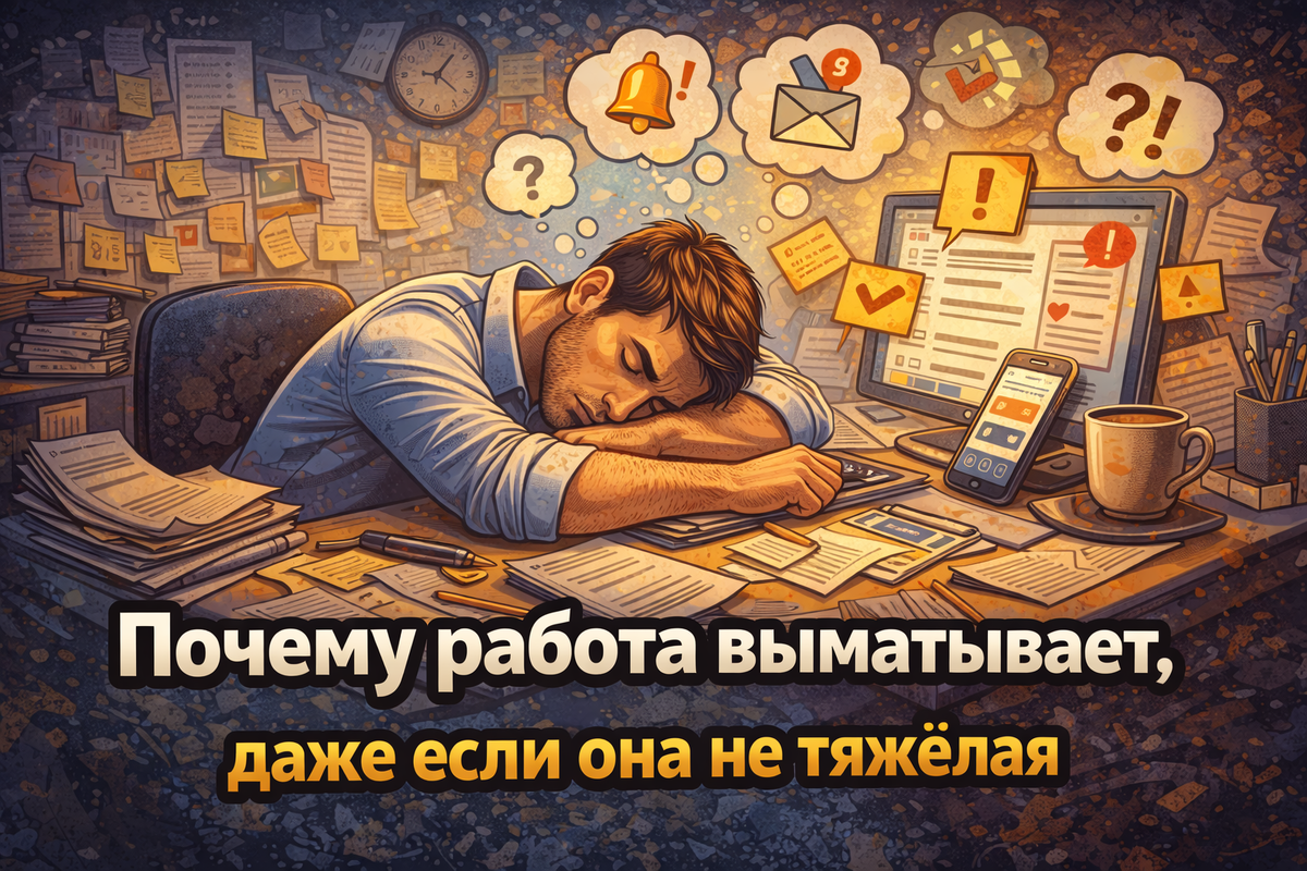 Зато почти всегда требует постоянного внимания. Сообщения, задачи, уведомления, дедлайны, мелкие решения.