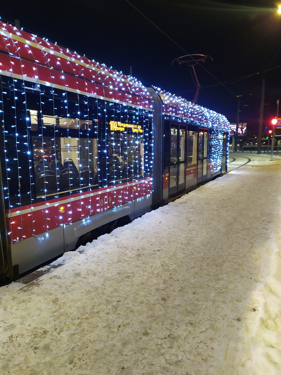 Мне б такие же проблемы - какую конфету съесть, в какой сугроб нырнуть... а не вот это вот всё - какую таблетку принять, что на завтра ему на обед приготовить... И вот примерно в таком настроении я увидела этот трамвай. Это был просто всплеск положительных эмоций. Сразу настроение праздничное появилось, захотелось наряжать несчастную ёлку, которую я уже два раза доставала и убирала. Он весело сиял гирляндами и радовал глаза и душу.