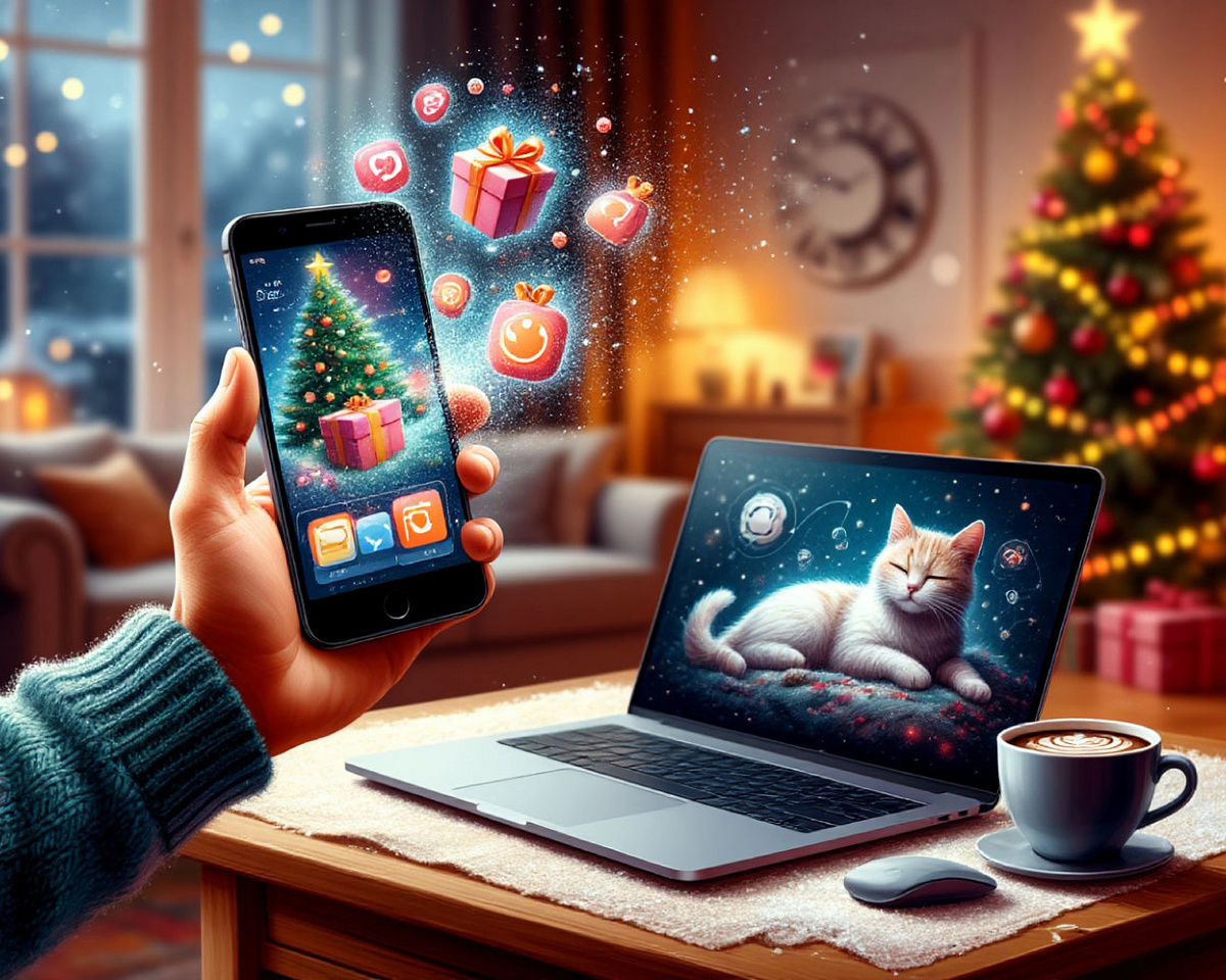 > Для Яндекс Арт: «Рука держит смартфон, из экрана которого, как волшебная пыль, вылетают иконки: подарок, ёлка, часы, улыбающийся смайлик. Фон — размытые огни гирлянд. Стиль: цифровая живопись, тёплые цвета, магия».