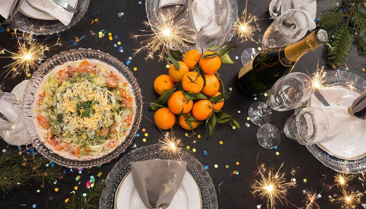 Каждый Новый год на наших столах, как по волшебству, появляется один и тот же набор. Запах мандаринов, хруст свежего салата «Оливье» и щелчок открываемой бутылки шампанского. Мы редко задумываемся: а почему именно они? Оказывается, эта триада — не древняя традиция, а гениальный результат советского дефицита, удачной логистики и народной смекалки. Давайте разберёмся по порядку!