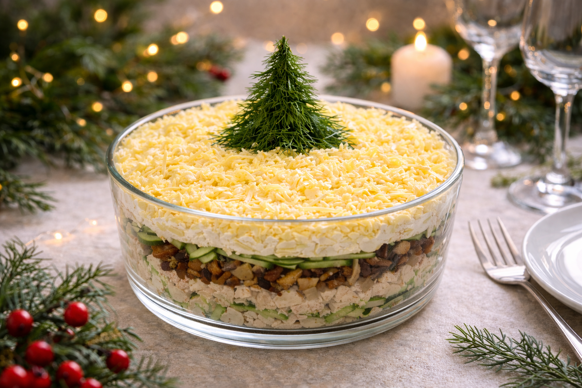 А помните, как на новогоднем столе один салат исчезает первым, а гости шепотом спрашивают рецепт? Вот именно такой — наш «Новогодний фаворит»! Нежная курица, ароматные шампиньоны, хрустящий огурец и тягучий сыр... Это не просто салат, это хит праздника, который я готовлю уже годы. Простой, сытный, но не тяжёлый — и всегда идеально пропитанный. Если вы ищете рецепт, который удивит всех и не потребует часов на кухне, то вы по адресу. Давайте готовить — обещаю, получится с первого раза! Что делает этот салат настоящим фаворитом Это сочетание — классика, проверенная временем: Плюс, он выглядит шикарно в слоях — настоящее украшение стола. А калорий можно регулировать, взяв лёгкий майонез. Ингредиенты (на 6–8 порций — хватит на компанию) Пошаговый рецепт: всё просто и быстро Курица