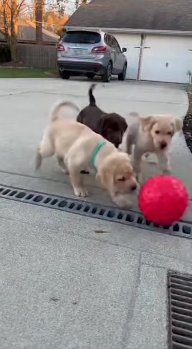Четыре маленьких щенка лабрадора играли с красным резиновым мячиком на дорожке у дома. В какой-то момент игрушка отскочила в сторону и закатилась в металлическую водосточную решетку. Мяч застрял между прутьями, и щенки не смогли его достать. Они собрались вокруг, беспомощно скуля и кружа возле решетки. #щенки #лабрадор #животные