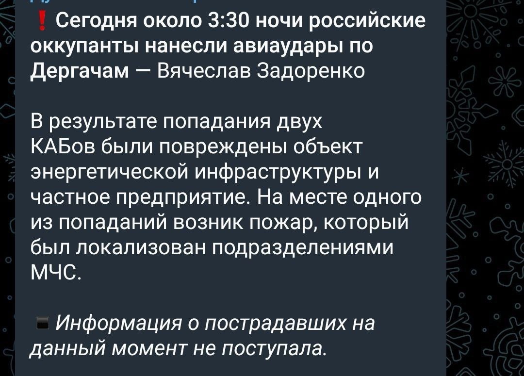 Ночью ударами УМПК был поражён энергетической объект в районе Дергачей Харьковской области