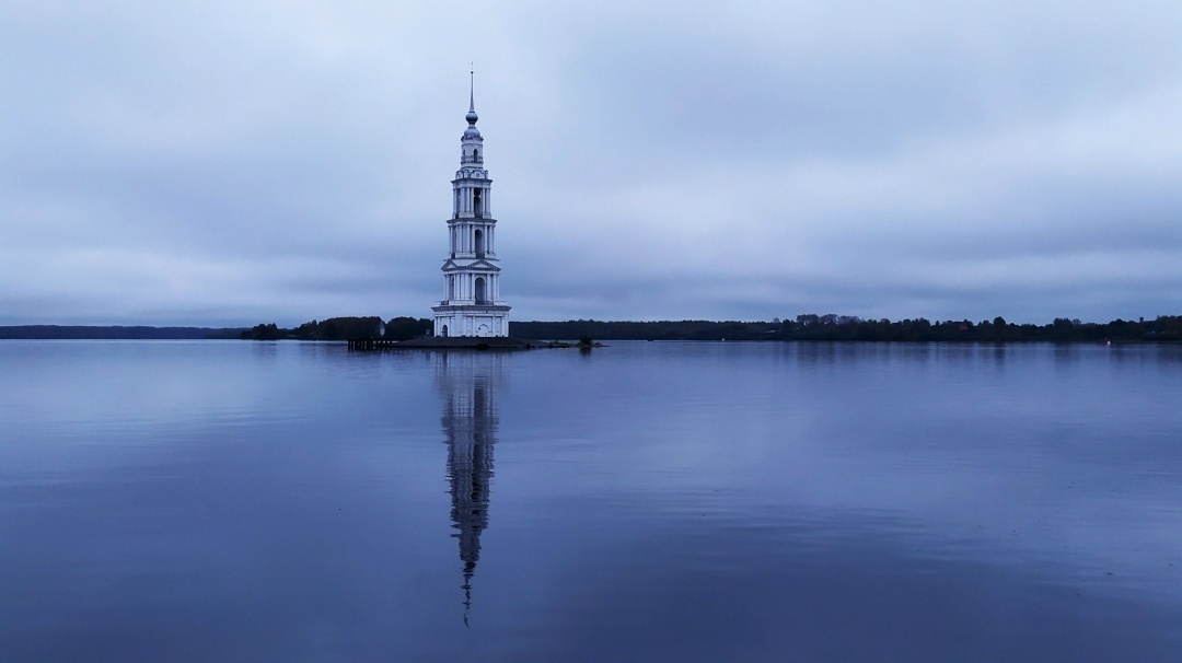В самом центре города, около берега Угличского водохранилища, рождённого водами великой реки Волга, посреди воды на небольшом насыпном искусственном острове стоит памятник русской архитектуры и историческое наследие 19-го века - колокольня, единственная оставшаяся часть ныне исчезнувшего Никольского (Николаевского) собора, входившего в состав Николо-Жабенского монастыря. Самый стойкий житель этого города. Она не просто стоит в воде. Она держит на своих плечах память об улицах, домах и судьбах, которые однажды ушли на дно вместе со старым Калязиным. С самого момента, когда с автомобильной части Московской улицы попадаешь на брусчатую тропу калязинского «Арбата» (является началом этой самой Московской улицы в городе), перед глазами прямо по курсу встаёт трёхцветная картина: голубо-синие вода и небо, тёмно-зелёная полоса другого берега, а также белая свеча колокольни, будто восставшая прямо из воды. Именно от берега напротив колокольни и начинается Московская улица в городе Калязин. На вс