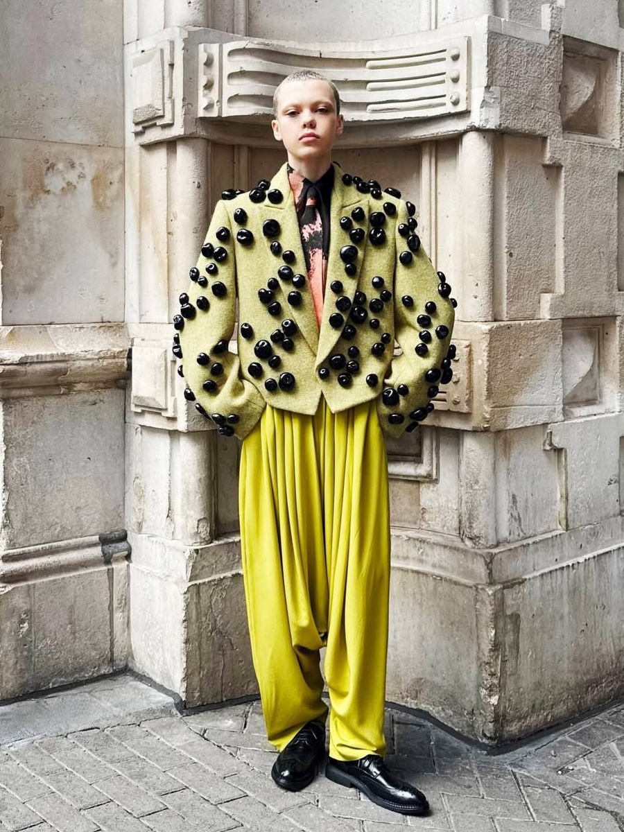 Крупные бусины на жакетах, украшениях, сумках и обуви у молодого бренда Rory William Docherty