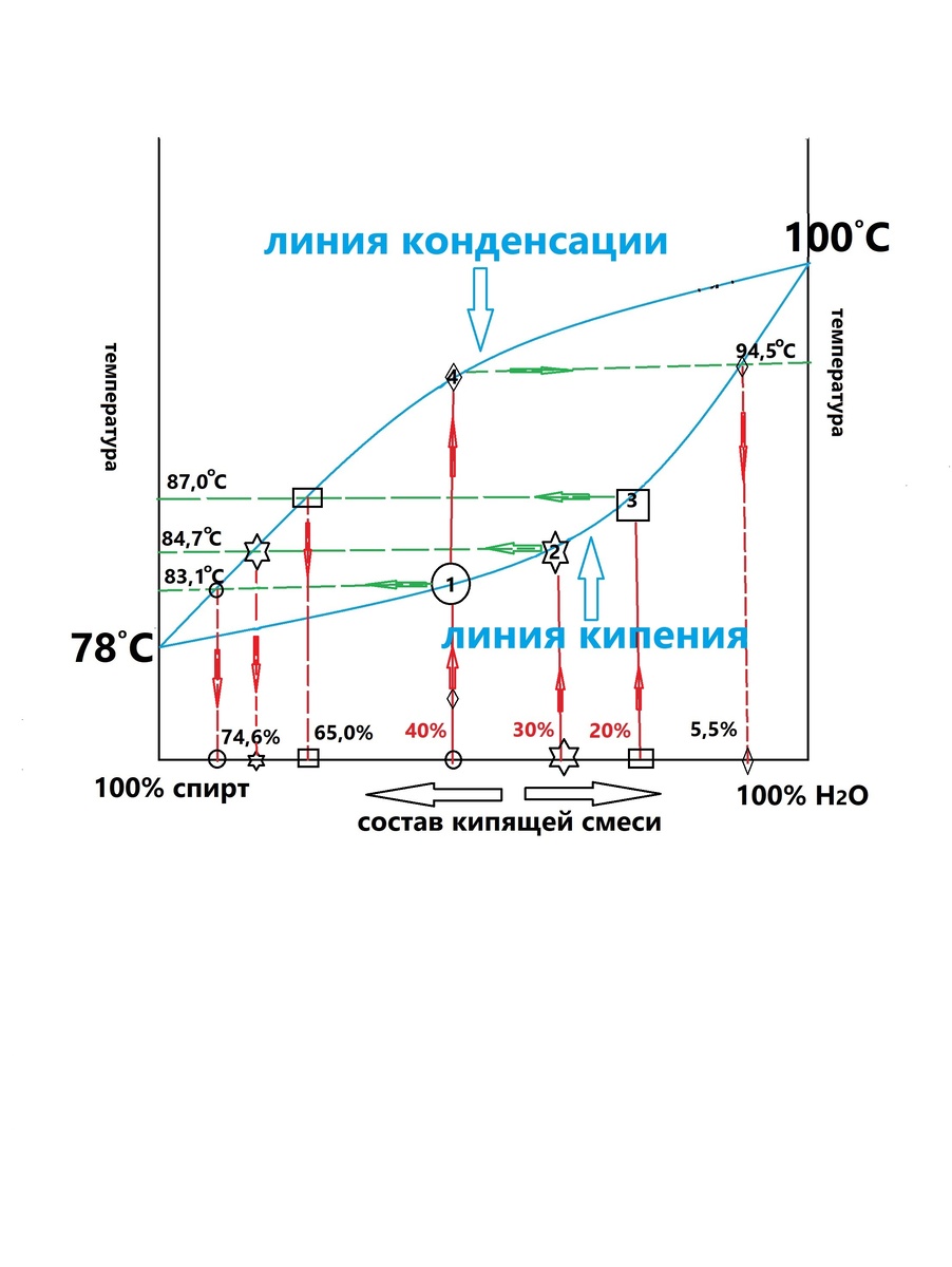 Линии кипения и конденсации. Точки кипения этанола и воды соединяют две синих линии – нижняя синяя линия кипения смесей. Предположим на оси Х (дне) мы взяли смесь, содержащую 40% этанола – точка 1: схема дистилляции через точку 1 обозначена кружочками. Смесь нагревается от комнатной температуры до температуры кипения. Это красная вертикальная линия 40%. Смесь закипает в точке 1. Температура кипения 83.1С. Теплу взяться НЕ откуда, поэтому образуется пар, той же температуры что и кипящая смесь/брага (зеленая линия). На рисунке мы видим вторую/верхнюю синюю линию. Это линия конденсации. При температуре 83,1С насыщенный пар этанол-вода имеет концентрацию 74,6% этанола (пересечение зеленой линии и линии конденсации). Если этот пар попадет в холодильник, то он конденсируется именно с концентрацией 74,6% этанола. Общая схема процесса дистилляции для точки 1 выглядит так. Взяли смесь, содержащую 40% этанола и 60% воды. Нагрели до кипения это 83,1С. Испарили. Получили пар с температурой 83,1С. Пар охладили - получили жидкую смесь 74.6% этанола и 25.4% воды. Так работает дистилляция 40% раствора этанола.