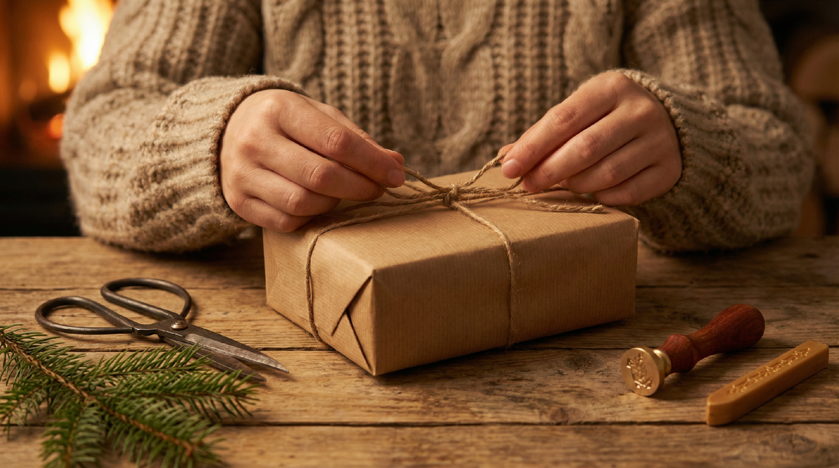 Сцена 2: Вам протягивают сверток в матовой крафтовой бумаге, перевязанный простой бечевкой, за которую заткнута маленькая еловая веточка.