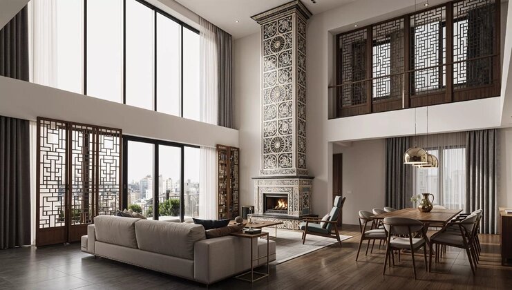 Фьюжн китайской графики и русского модерна в двухсветной гостиной — концепция‑эксперимент TimeAI, превращённая в цельный интерьерный сценарий. В основе проекта — идея соединить сдержанную философию восточного минимализма с эмоциональностью русского модерна. Двухсветная гостиная становится пространством диалога: строгая архитектура, чистый свет и графичные детали соседствуют с орнаментальной печью и тактильным теплом натуральных материалов. Пространство, отстроенное вокруг вертикали. Композиционный центр интерьера — высокая печь‑камин, облицованная авторской плиткой. Она цитирует образ русской печи, но интерпретирована в духе модерна: вытянутый объём на всю высоту пространства и сложный растительный орнамент превращают её в арт‑объект. Спокойная гамма из сливочно‑серых и графитовых оттенков позволяет использовать богатый рисунок без визуального шума. Печь выстраивает вертикальную ось и связывает оба уровня гостиной, подчёркивая эффект «высокого» пространства и собирая вокруг себя сцена