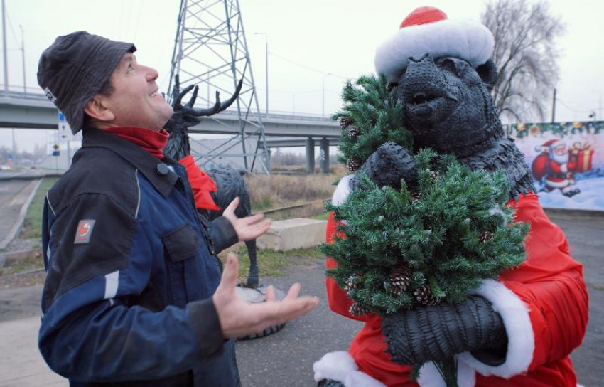 Раньше всех в праздничный новогодний костюм облачился еще один персонаж Вячеслава – пятиметровая горилла. Скульптуру из шин невозможно не заметить – она встречает проезжающих автомобилистов при въезде в город со стороны Цимлянского моста.