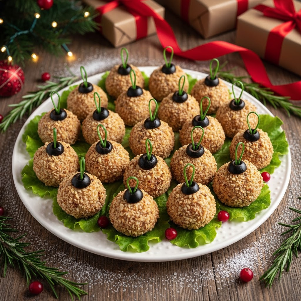 Выложите на блюдо. На верхушку каждого шарика положите половинку маслины и вставьте в нее петельку из зеленого лука, имитируя крепление елочного шара.