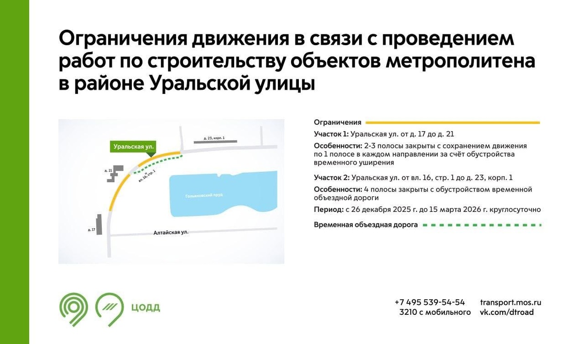 до 15 марта 2026 г. на участках Уральской улицы будут недоступны для движения 2-4 полосы. Это связано с проведением работ по строительству объектов метрополитена. Пост ВК