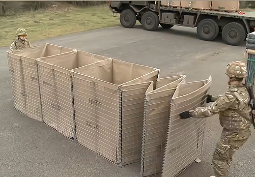 Это каркас современной военной инфраструктуры. Именно из таких барьеров вырастают периметры баз, полевых лагерей, наблюдательных постов и блокпостов. Складная металлическая сетка, выстланная плотной геотекстильной тканью, по
