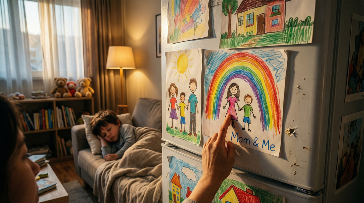 Пусть живёт в своей версии мира — пока может. Но однажды утром она увидела нечто новое. На самом видном месте, под магнитом-солнцем, висел рисунок: только двое — мальчик и женщина, держащиеся за руки под радугой. Надпись: «Мы с мамой. Она сильная». Сердце у неё сжалось. Она вошла в детскую. Саша ещё