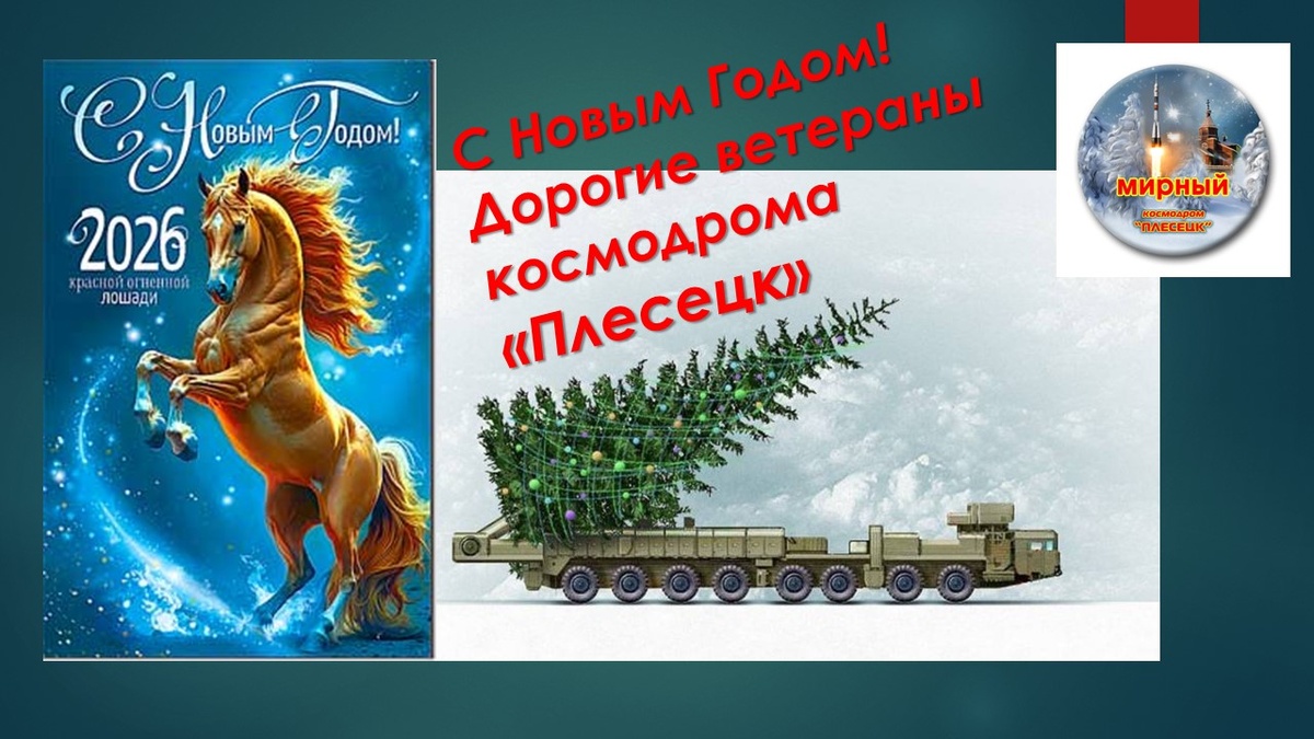 В уходящем году у ветеранов были не только радости, но и заботы. Но сейчас мы начинаем с чистого листа! Пусть 2026-й пройдет под эгидой счастья, здоровья, удачи. А любые начинания или планы воплощаются наяву и не остаются в мечтах! Все мы мечтаем, чтобы загаданное в новогоднюю ночь желание осуществилось. Пусть в наступающем году Красной Огненной Лошади хватит сил, энергии, бодрости, удачи и здоровья, чтобы воплотить самые смелые планы и желания. Желаем нашим приемникам новой мудрости в решении ракетно-космических задач. Пусть на смену зимних ночей над городом Мирным придут БЕЛЫЕ НОЧИ! Пусть под новогодней елкой на главной площади города останутся все горести и заботы прошлого года..... Тысячи километров, десятки городов и населённых пунктов – новогоднее турне главного Деда Мороза, которого с нетерпением ждут во всех уголках нашей необъятной Родины, всегда весьма насыщенное. В плотном графике посещений волшебника, стремящегося поздравить максимальное количество россиян от мала до ве