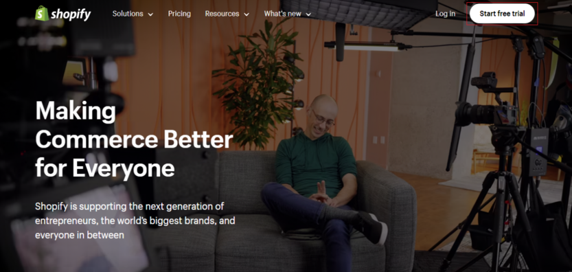 Перейдите на официальный сайт Shopify, затем в верхнем углу нажмите на «Start free trial».