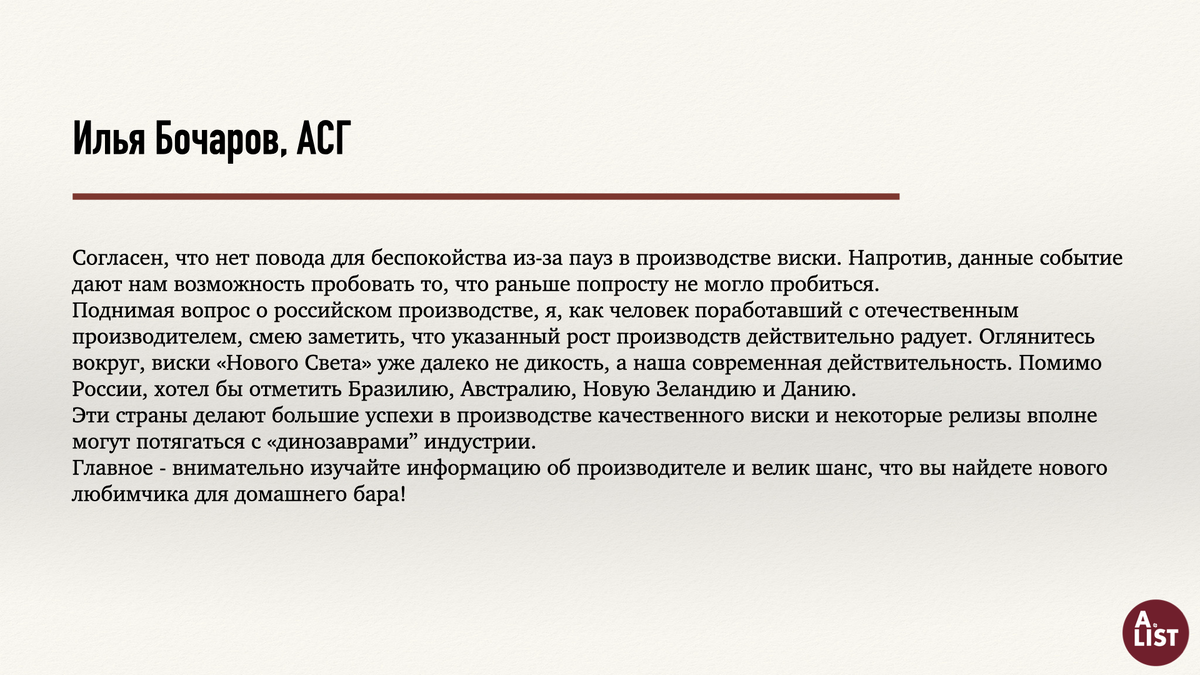 Комментарии коллег импортёров к материалу «Виски на паузе» оказались интереснее самой статьи. Вместо прогнозов — слова тех, кто считает деньги каждый день Мы написали о глобальном затоваривании складов. Коллеги ответили о локальном выживании. И эта разница в оптике — главное, что стоит обсудить. Мировые новости о паузе производств читаются как отраслевой детектив. Для российского участника рынка это фоновый шум. Его реальность — курсовые качели, растущие налоги, непредсказуемая логистика и потребитель, который всё чаще проходит мимо полки. «Спрос действительно просел. Для российского рынка это двойная история: распродажи будут — затоваренные склады надо разгружать. Но подорожание виски также неизбежно: налоговая нагрузка растёт, логистика не дешевеет. Некоторые коллеги уже отказываются от собственного импорта — при текущих условиях это просто перестаёт быть рентабельным». — Роман Табаков, Бренд-эксперт, «Балчуг Менеджмент» Когда профессионалы называют выход из бизнеса рациональным реше