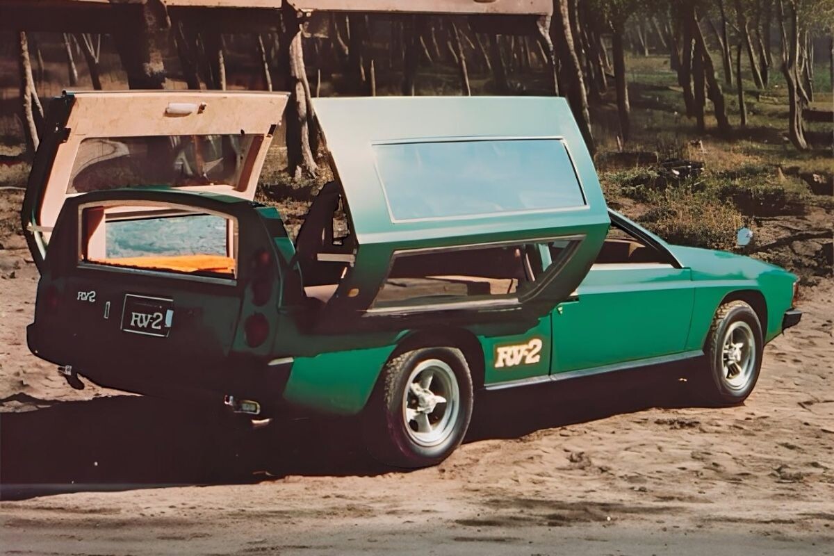 Идеологически RV-2 пытался соединить два мира: удобство и маневренность универсала/спортмашины и бытовой комфорт кемпера. В 1972-м это выглядело футуристично: полноценная трансформация кузова, палатка как часть конструкции, альтернативный кемпинг, рассчитанный на людей, которые хотят ездить быстро и жить на природе стильно.