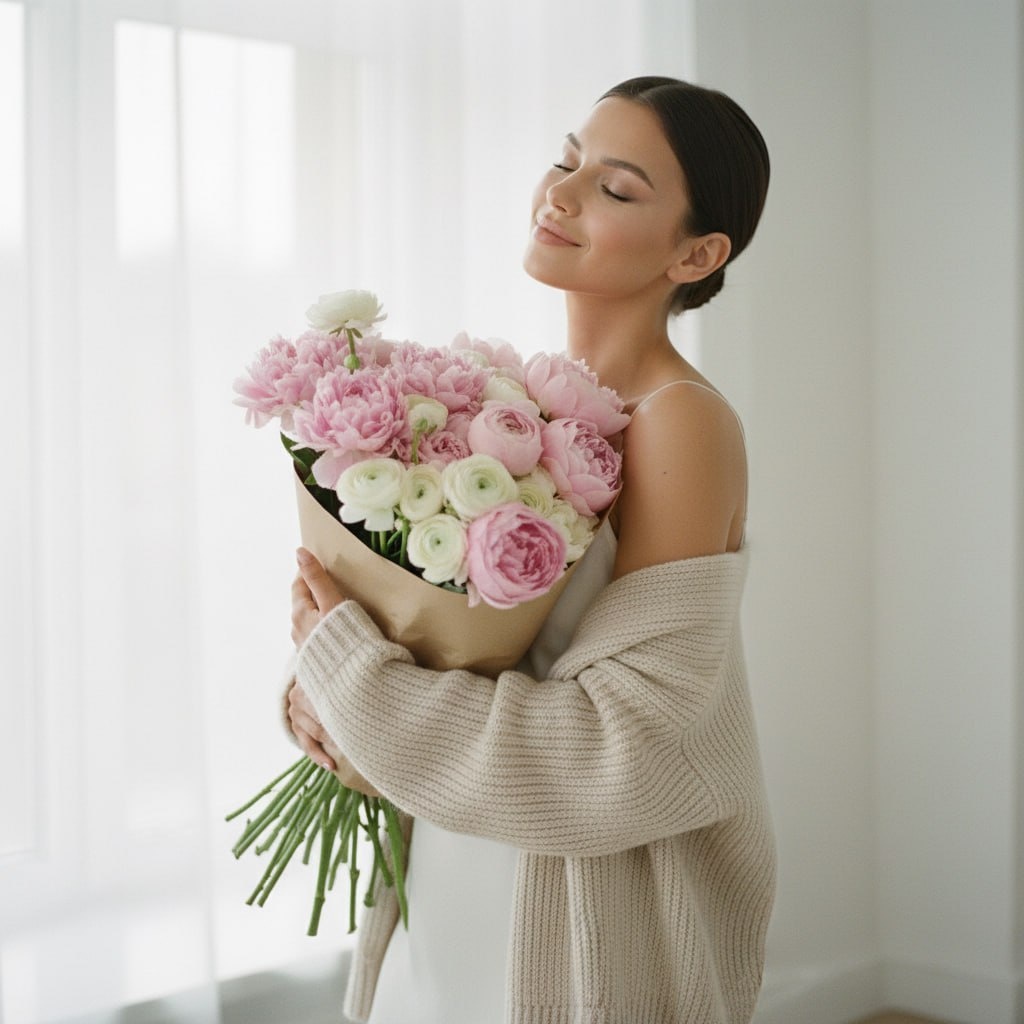 🔥 Тот самый промпт для тех, кому не хватает воздуха и эстетики Pinterest в ленте. Закидываем свое селфи в бот, выставляем сходство и получаем идеальный мягкий портрет. ⚡️ Используя загруженное селфи как точный референс лица с полным сохранением всех черт и идентичности на 100%, создай фотографию по описанию, сохраняя абсолютное сходство лица. Эстетичный [художественный портрет] в пастельных тонах. Девушка [нежно прижимает к себе огромный букет цветов, прикрыв глаза от удовольствия]. Одета в [светло-бежевый кашемировый кардиган крупной вязки поверх белого шелкового платья-комбинации на тонких бретелях]. В руках [огромная охапка нежно-розовых пионов и белых ранункулюсов в обертке из минималистичной крафтовой бумаги]. [Мягкий рассеянный дневной свет из большого окна], создающий эффект легкой дымки и чистоты. [Средний план, ракурс три четверти]. Фотореалистично, малая глубина резкости, зернистость кинопленки, нежная цветокоррекция, 8K, объектив 85мм. Как менять: 👀 🎯 Ракурс (замени [