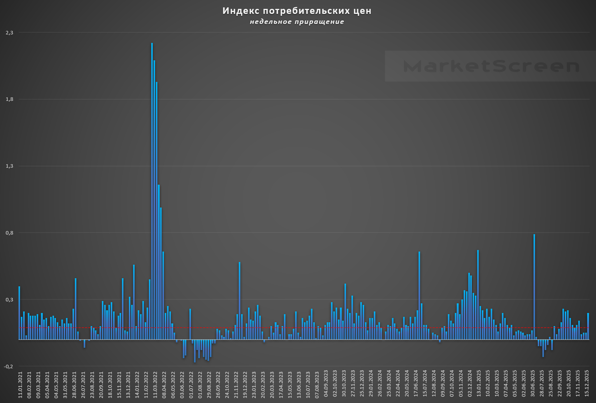 За период с 16 по 22 декабря 2025 г. индекс потребительских цен, по оценке Росстата, составил 100,20%