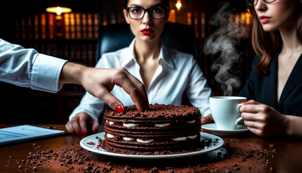 В бухгалтерию ООО «Вектор» нельзя было просто войти. Туда можно было только совершить интервенцию. В воздухе пахло перегретым ксероксом и какими-то запредельно дорогими духами, которые Марья Ивановна использовала как химическое оружие. На столе, среди актов сверки, лежал Он. Вафельный торт «Причуда». Шесть слоев первобытного греха, залитых глазурью цвета темной страсти. – Я пришел за актами, – соврал я, чувствуя, как пульс бьет в висках. – Акты подождут, – томно ответила Людочка, облизывая маленькую пластиковую ложечку так, будто это был запретный плод. – У нас тут... переучет калорий. Я понял: сейчас или никогда. Это был суицид, но какой элегантный! – Дамы, – я сделал шаг к столу, глядя прямо в глаза Марье Ивановне. – Я конфискую это кондитерское изделие. Оно не прошло аудит моей совести. В кабинете стало тихо, как в налоговой после вопроса «откуда деньги?». Марья Ивановна медленно отложила дырокол. Она встала, и ее бюст пятого бухгалтерского размера качнулся вперед, как неопровержим