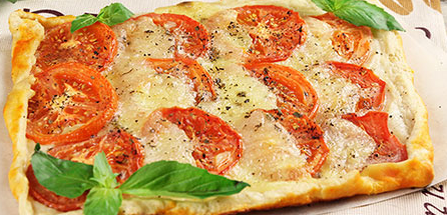 Ингредиенты: - 8 средних помидоров - ½ ч. л. молотого черного перца - соль - 1,5 стакана муки - 100 г сливочного масла - 1 пучок базилика - 8 крупных яиц - 3 стакана молока - 150 г плавленого сыра с чесноком и травами Приготовление: Помидоры нарежьте кружочками, разложите на противне, смазанном сливочным маслом, и запеките в духовке около 30 минут. Смешайте муку и ½ ч. л. соли, нарежьте кусочками размягченное сливочное масло и смешайте с мукой до консистенции крошек. Добавьте постепенно 5-6 ст. л. воды и замесите тесто. Раскатайте тесто на присыпанном мукой столе в форме квадрата по размерам больше, чем форма или противень. Аккуратно переложите пласт теста на противень, из выступающих краев сформируйте бортик и придайте ему волнистую форму. Накройте пирог пленкой и приступите к приготовлению начинки. Базилик промойте, подсушите и нарежьте. Смешайте с яйцом, молоком, сыром и солью до однородной массы. Вылейте яичную смесь в корж. Лопаточкой осторожно снимите с противня запеченные помидо