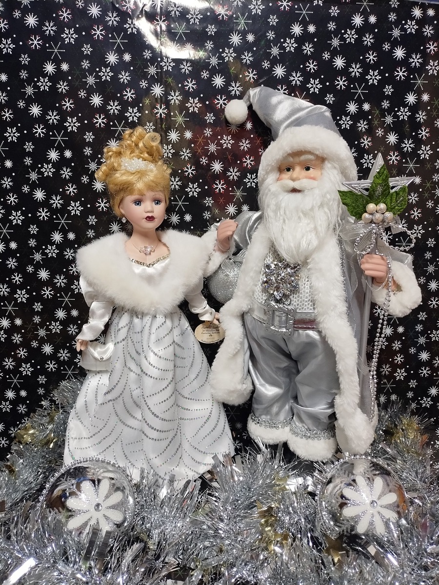 Всем доброго дня! Продолжаю серию новогодних фотосюжетов с разными куклами из моей коллекции. У меня их много и все они хотят отметиться хоть раз, показаться широкой публике. Сегодня две куколки, фарфоровые коллекционные, и к тому же- праздничные. Одна из них- кукла Ангел. Другая просто в нарядном белом платье, ну и конечно, Санта. Этот персонаж просто обязан быть на Новогодних фотосессиях. И кукол -Санта у меня тоже несколько, вот сейчас в кадре пока один, такой необычный Санта весь в серебристом наряде. Первая куколка -вот как раз с ним и снимается, с Сантой. Если бы она была в меховой шапочке- можно было бы и образ Снегурочки примерить. Зато у нее боа на плечах - из белого мягкого меха. И очень нарядное атласное платье. И маленькая атласная сумочка в руке. Эта куколка- настоящая Леди. Зимняя фантазия. Эти куколки больше и выше, чем Барби. Высота их 40+ см. ****************************************************************************** Вторая куколка - просто Ангел, настоящий Анге