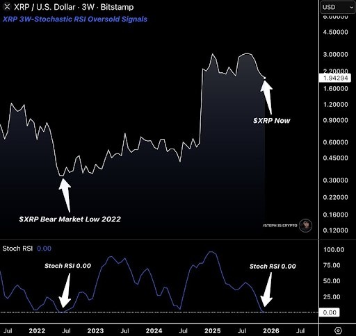 📈 Криптоаналитик Steph обратил внимание на 3-недельный график XRP, где индикатор Stochastic RSI опустился до 0.00. Это редкое явление, ранее наблюдалось только при достижении дна медвежьего рынка в 2022 году, что указывает на полное истощение давления продавцов. 📊 Ключевые моменты: - XRP торгуется около $1.87. - Снижение Stochastic RSI до 0.00 на 3-недельном графике, что исторически предшествовало ралли. - Аналитик CryptoXLarge отмечает, что XRP остается ниже нисходящей линии тренда и уровня 8-21 EMA. - Ключевая зона поддержки около $1.95 (Fib 0.5 и 89-недельная EMA). - Прорыв ниже $1.95 может привести к падению до $1.60 (Fib 0.618). - Закрепление выше $1.95 может спровоцировать рост до $2.30, затем до $2.70, а в перспективе до $3.66.