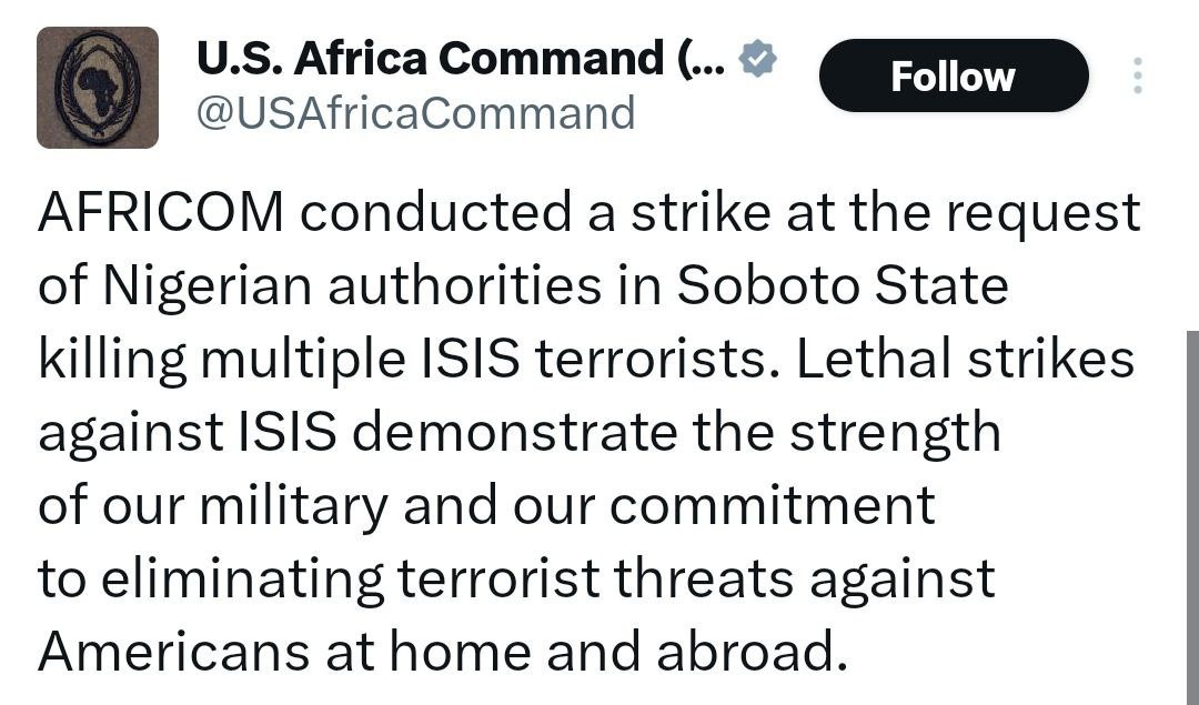 AFRICOM: Nigeria strikes conducted 'AT REQUEST' of Nigerian authorities