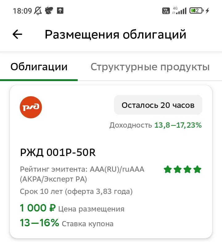 Всем привет! На этой неделе - вновь интересные размещения. В частности, порадовал перед новогодними праздниками мой любимый эмитент - ОАО "РЖД". Облигация РЖД 001Р-49R вышла только для квалов, что немного расстроило, ведь стараюсь приобретать в свой портфель все их новые выпуски. Зато свежая бумага - облигация РЖД 001Р-50R - оказалась доступна для неквалифицированных инвесторов (хотя в следующем году подумываю получить статус квала и расширить свои возможности на фондовом рынке). Я сразу подала заявку на участие в первичном размещении (стараюсь иметь свободные средства, которые храню в фонде "Сберегательный" УК "Первая"). Особенности выпуска: Ставка 1-го купона по облигациям РЖД 001Р-50R составит 15,35% годовых. Сбор заявок проходил до 23.12.2025, 14:45 мск. Ключевая информация о выпуске: Мне нравятся бумаги с ежемесячной выплатой купонного дохода, который можно сразу пустить в дело (я обычно их реинвестирую). Выпуск без амортизации. Сведения об эмитенте (хотя, полагаю, с ОАО "РЖД" все