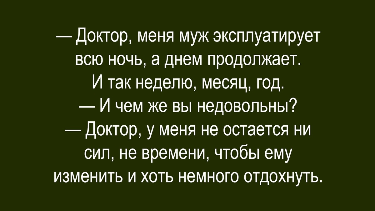 ☺☺☺ Тормозит бабка такси, ну и садится с козой... Обалдевший таксист: — Бабка, ты чё?! С козой в такси?! — А шо, милок - рази ж низя?! Я намедни слышала, шо ты и тёлок возишь! ❗️ ❗️ ❗️ Помоги сообществу попасть в топ поиска платформы: Одноклассники, ВКонтакте, Дзен, Телеграм! Для этого нужно подписаться на сообщество, делиться постами по всему интернету и на других социальных платформах, комментировать посты, ставить классы-лайки-дизлайки! Всем спасибо за эти действия!!! Ваши комментарии все читаются и все положительные, радуют не только нас, но и наших читателей не хуже самих постов! Все ссылки на наши ресурсы находятся в описании сообщества...