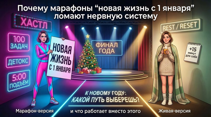 Что не так с идеей “обнулиться к Новому году” и какой подход реально бережёт психику и энергию Каждый декабрь на нас обрушивается одно и то же: марафоны продуктивности, челленджи «успей до 31‑го», курсы «новая версия тебя за 7 дней». Выглядит как мотивация. Но если посмотреть глазами психологии и исследований, это чаще прямой путь к выгоранию и нервному срыву, а не к «новой жизни». Почему так происходит? 1. Конец года — не время для рывка, а время естественного спада Психологи пишут, что к концу года у большинства людей естественно падает энергия и концентрация: накопленная усталость, недосып, эмоциональные качели, больше обязательств и меньше восстановления. При этом: рабочие и личные задачи не уменьшаются, а часто растут; к этому добавляются ожидания праздников, подарков, «правильного» настроения. То, что нам продают как «лень и слабую дисциплину», на самом деле очень часто — усталая нервная система, которой не дают права замедлиться. 2. Слишком резкие цели = прямая дорога к выгорани