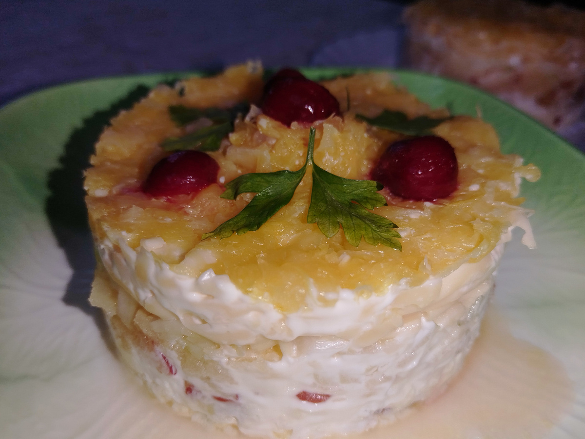 Ингредиенты на 2-4 порции - апельсин-500 гр, примерно 5 шт. - яйцо – 200 гр. 4 шт. - яблоко – 200 гр. ,1 большое - сыр твердый – 100 гр. - майонез – 60 гр. - лук репчатый – 50 гр. - вода 100 мл. - сок лимонный – 15 мл., половинка лимона - уксус – 10 мл. - соль - специи по вкусу Приготовление: Лук нарезать кубиками, воду смешать с уксусом, залить полученным маринадом лук на 10 мин. Яйца сварить вкрутую, Яблоко очистить от сердцевины. Апельсины очистить, вырезать дольки из мембран. Сыр, яйца и яблоки натереть на крупной терке. Яблоки сбрызнуть лимонным соком. Также апельсин натереть или мелко нарезать. Выкладывать слоями добавляя по вкусу соль и специи: яйца, майонез, яблоко, лук, сыр, апельсин.